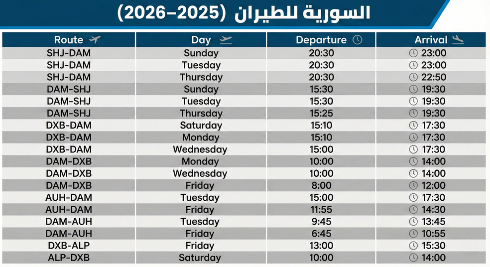 تقدم فلاي إن ترافل خدمة حجز رحلات طيران سلسة مع الخطوط الجوية السورية، مما يوفر للمسافرين تجربة سهلة ومريحة لحجز رحلاتهم إلى وجهات مختلفة. من خلال فلاي إن ترافل، يمكنك الاطلاع على أحدث جداول الرحلات، وأسعار تنافسية، وعروض حصرية على رحلات الخطوط الجوية السورية، لتلبية احتياجات مسافري الأعمال والترفيه على حد سواء.